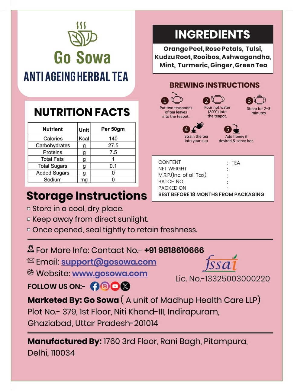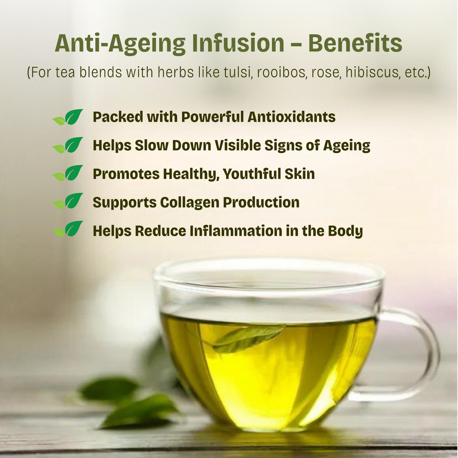 Ingredients : Orange Peel, Rose Petals, Tulsi, Kudzu Root, Rooibos, Ashwagandha, Mint, Turmeric, Ginger, Green Tea Benefits: The Anti Ageing infusion also known as Antioxidant power house offers immense benefits such as improved skin elasticity, Protection against UV Rays and reduced skin wrinkles and hence promotes a youthful appearance by encouraging cell turnover and repair. Orange Peel : A rich source of Vitamin C, Boosts the hydration level revealing a glowing complexion, Embodied with an Important Protein Collagen that helps mMaintain skin elasticity and firmness. Rose Petals : These Petals are excellent for overall wellness, in addition to acquiring flawless skin properties. Tulsi : Rich in Anti Inflammatory, Anti Oxidant Rich and Anti Microbial Properties, Tulsi the Holy Basil helps treating Various Skin Issues, Reduces signs of ageing and Blemises. Kudzu Root : It helps to boost the collagen production, along with Antioxidant properties helps reduce wrinkles and improves skin elasticity. Rooibos: Rich in Antioxidants and Anti Inflammatory Properties, Commonly known as Red Tea reduces skin elasticity. Ashwagandha : It helps reduce Oxidative stress by promoting collagen production and hence slows down the ageing progression. Mint : A natural astringent with anti-inflammatory properties hydrates skin and cleanses pores. Turmeric : Well Known by its Anti Oxidant and Anti Inflammatory properties Turmeric provides protection against cellular damage. Green Tea : Rich in compounds like Catechins Green tea provides protection against oxidative stress and reduces cellular damage and rejuvenates the overall skin.